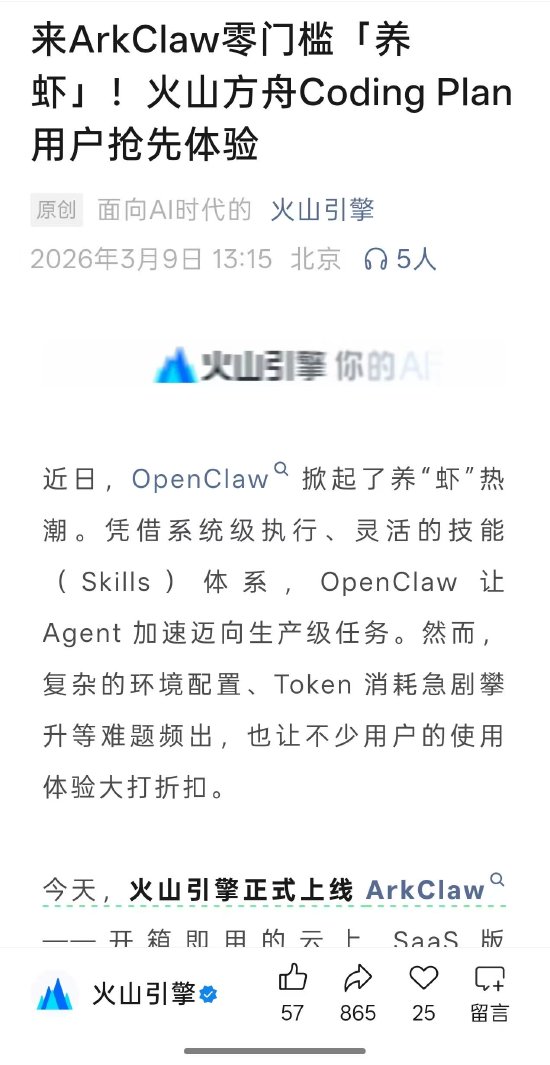 开箱即用的“小龙虾”!字节跳动火山引擎正式上线ArkClaw